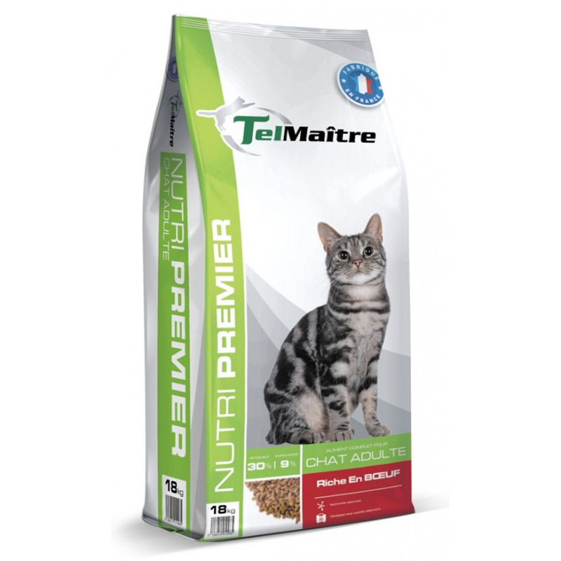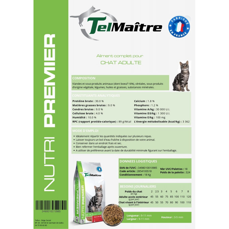 L’aliment NUTRI PREMIER CHAT TelMaître satisfait les exigences gustatives des chats et apporte à votre chat les éléments essentiels à sa vitalité.