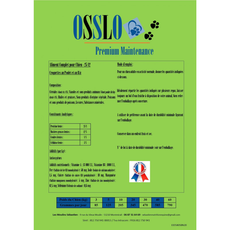 OSSLO PREMIUM MAINTENANCE est un aliment sec complet pour chien ayant une activité normal.