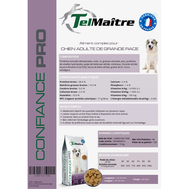 L’aliment CONFIANCE PRO ADULTE Grande race TelMaître a été spécialement conçue pour les chiens adultes de grande taille.